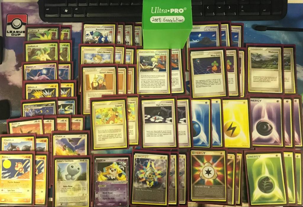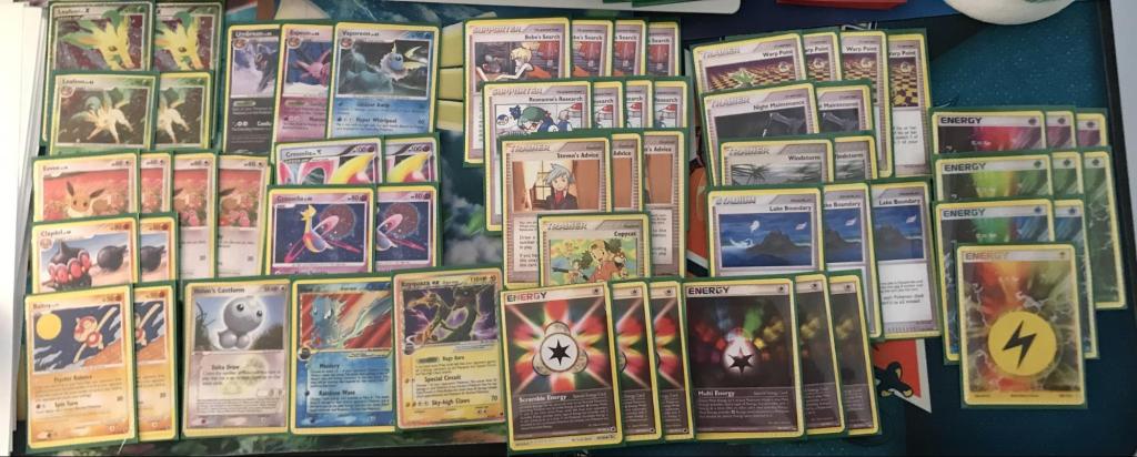 | 2 Leafeon Lv.X 2 Leafeon 2 Espeon 2 Jolteon 1 Umbreon 1 Vaporeon 4 Eevee 2 Claydol 2 Baltoy 1 Chatot 1 Holon’s Castform 1 Jirachi ex | 4 Roseanne’s Research 3 Celio’s Network 3 Steven’s Advice 2 Copycat 2 Bebe’s Search 2 Night Maintenance 3 Lake Boundary 3 Warp Point 2 Windstorm | 3 Double Rainbow Energy 3 Scramble Energy 3 Grass Energy 3 Psychic Energy 2 Water Energy 1 Lightning Energy |