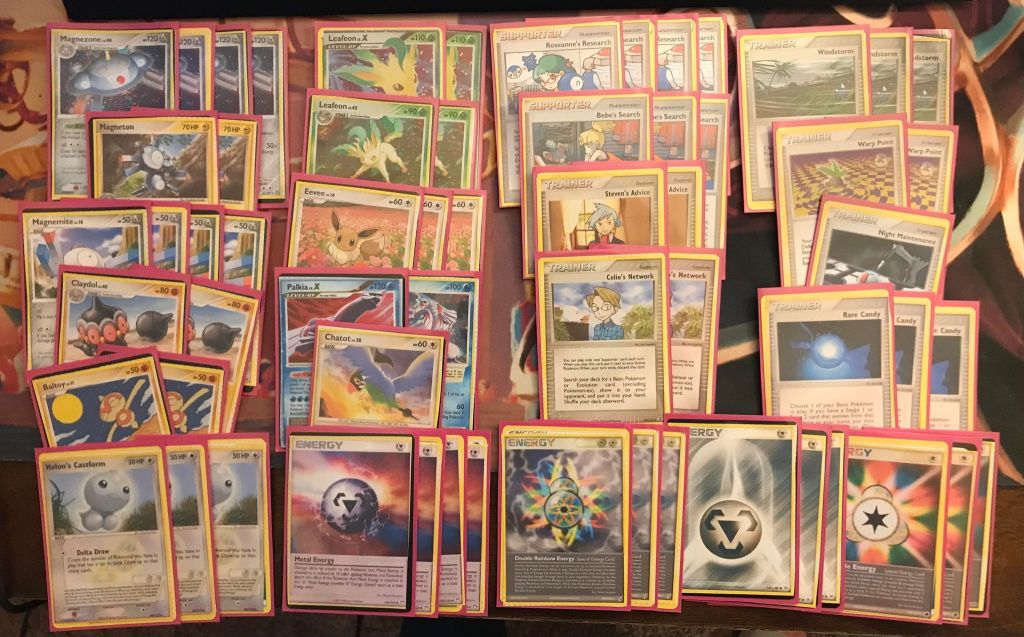 | 2 Leafeon Lv. X 2 Leafeon 3 Eevee 4 Magnezone 2 Magneton 4 Magnemite 2 Claydol 2 Baltoy 1 Palkia Lv. X 1 Palkia 1 Chatot 3 Holon’s Castform | 4 Roseanne’s Research 3 Bebe’s Search 2 Steven’s Advice 2 Celio’s Network 3 Rare Candy 3 Windstorm 2 Warp Point 1 Night Maintenance | 4 Metal Energy (Special) 3 Double Rainbow Energy 3 Metal Energy (Basic) 3 Scramble Energy |