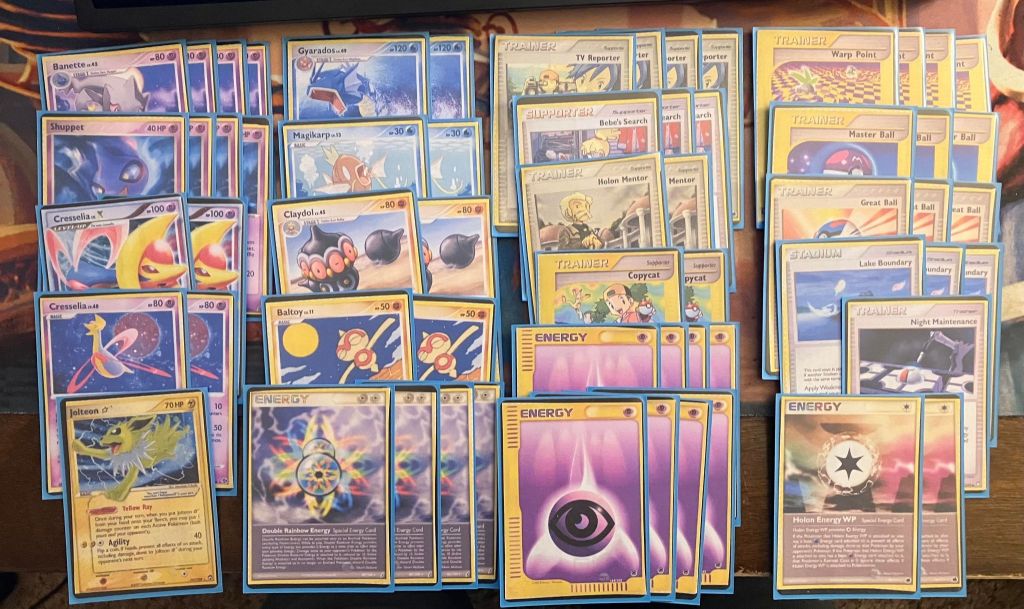 | 4 Banette 4 Shuppet 2 Cresselia Lv.X 2 Cresselia 2 Gyarados 2 Magikarp 2 Claydol 2 Baltoy 1 Jolteon Star | 4 TV Reporter 3 Bebe’s Search 2 Holon Mentor 2 Copycat 4 Warp Point 3 Master Ball 3 Great Ball 3 Lake Boundary 1 Night Maintenance | 8 Psychic Energy 4 Double Rainbow Energy 2 Holon Energy WP |