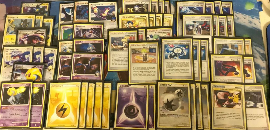 | 3 Garchomp 1 Garchomp 2 Gabite 4 Gible 1 Dusknoir 1 Duskull 2 Claydol 2 Baltoy 2 Crobat G 1 Azelf 1 Uxie 1 Unown G 1 Chatot | 4 Bebe’s Search 2 Roseanne’s Research 2 Pokémon Collector 2 Judge 1 Palmer’s Contribution 4 Rare Candy 2 Warp Point 2 Pokémon Communication 2 Pokémon Reversal 2 Expert Belt 1 Poké Turn 1 Luxury Ball 2 Broken Time-Space | 4 Double Colorless Energy 4 Call Energy 2 Cyclone Energy 1 Psychic Energy |