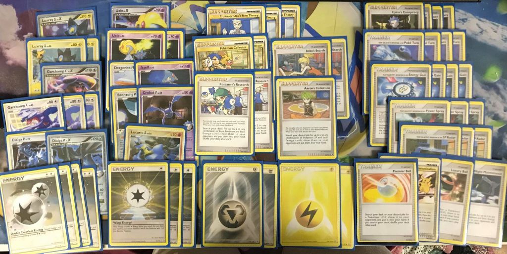 | 1 Garchomp C Lv. X 3 Garchomp C 1 Luxray GL Lv. X 2 Luxray GL 1 Dialga G Lv. X 1 Dialga G 1 Lucario GL 1 Bronzong G 1 Crobat G 1 Dragonite FB 1 Uxie 2 Uxie Lv. X 1 Azelf | 4 Cyrus’s Conspiracy 3 Professor Oak’s New Theory 2 Pokémon Collector 2 Roseanne’s Research 2 Bebe’s Search 1 Aaron’s Collection 4 Energy Gain 4 Poké Turn 3 Power Spray 3 SP Radar 1 Pokémon Communication 1 Luxury Ball 1 Night Maintenance 1 Premier Ball | 4 Double Colorless Energy 3 Warp Energy 2 Lightning Energy 2 Metal Energy (Basic) |