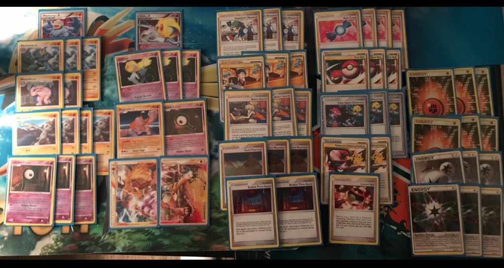 Machamp’s goal was to be aggressive early and take as many Kos as possible. Take Out automatically KOs any unevolved pokemon, so it had very strong matchups against most SP decks, and had the potential to steal games on the first turn of the match with Take Out if the opponent couldn’t find extra basic pokemon. It also shut down basic pokemon that are commonly played as starters, like Chatot, Pachirisu, or Spiritomb. The Entei & Raikou LEGEND was mostly used to clean up the board at the end of the game, and was a great way to force sudden death, where Machamp almost always has the advantage.