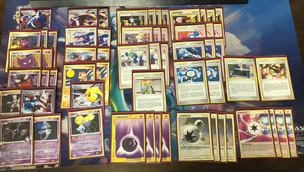 | 1 Gengar lv. X 3 Gengar 2 Haunter 3 Gastly 2 Garchomp C Lv. X 2 Garchomp C 1 Uxie Lv. X 1 Uxie 2 Claydol 2 Baltoy 1 Mewtwo Lv. X 1 Mewtwo 1 Crobat G 1 Azelf | 4 Cyrus’s Conspiracy 3 Bebe’s Search 3 Roseanne’s Research 1 Palmer’s Contribution 4 Pokemon Communication 3 Rare Candy 3 Poke Turn 2 Energy Gain 1 SP Radar 1 Luxury Ball | 4 Double Colorless Energy 4 Psychic Energy 4 Call Energy |