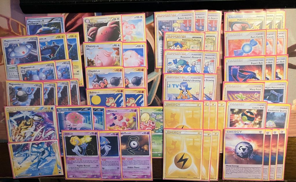 | 1 Magnezone Lv.X 2 Magnezone (SF 6) 1 Magnezone (DP 8) 2 Magneton 4 Magnemite 1 Blissey (Prime) 1 Blissey (PL 22) 1 Chansey (PL 69) 1 Chansey (MT 76) 2 Claydol 2 Baltoy 2 Spiritomb 1 Mr. Mime 1 Shuckle 1 Uxie 1 Azelf 1 Unown G 1 Raikou & Suicune LEGEND (Top) 1 Raikou & Suicune LEGEND (Bottom) | 3 Bebe’s Search 2 Pokemon Collector 2 Roseanne’s Research 2 Felicity’s Drawing 3 Pokemon Communication 3 Rare Candy 3 Expert Belt 1 Warp Point 1 Night Maintenance 1 Luxury Ball 1 Conductive Quarry | 7 Lightning Energy 4 Metral Energy |