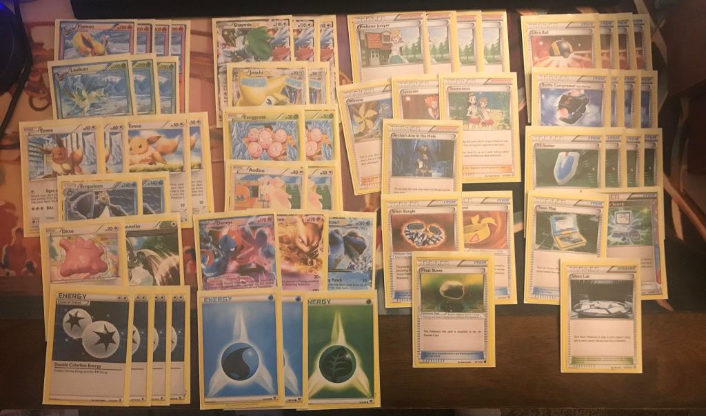 | 4 Flareon 3 Leafeon 2 Eevee (PLF 90) 2 Eevee (FFI 80) 2 Empoleon 1 Ditto 1 Bunnelby 3 Shaymin EX 2 Jirachi EX 2 Exeggcute 2 Audino 1 Deoxys EX 1 Mewtwo EX 1 Seismitoad EX | 4 Professor Juniper 1 Winona 1 Lysandre 1 Teammates 1 Archie’s Ace in the Hole 4 Ultra Ball 4 Battle Compressor 4 VS Seeker 1 Silver Bangle 1 Muscle Band 1 Float Stone 1 Town Map 1 Computer Search 1 Silent Lab | 4 Double Colorless Energy 2 Water Energy 1 Grass Energy |