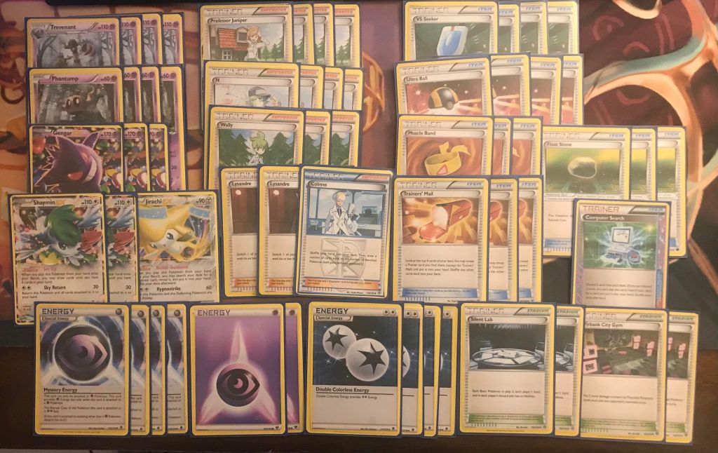 | 4 Trevenant 4 Phantump 3 Gengar EX 2 Shaymin EX 1 Jirachi EX | 4 Professor Juniper 4 N 3 Wally 2 Lysandre 1 Colress 4 VS Seeker 4 Ultra Ball 3 Muscle Band 3 Float Stone 3 Trainers’ Mail 2 Silent Lab 2 Virbank City Gym 1 Computer Search | 4 Mystery Energy 2 Psychic Energy 4 Double Colorless Energy |