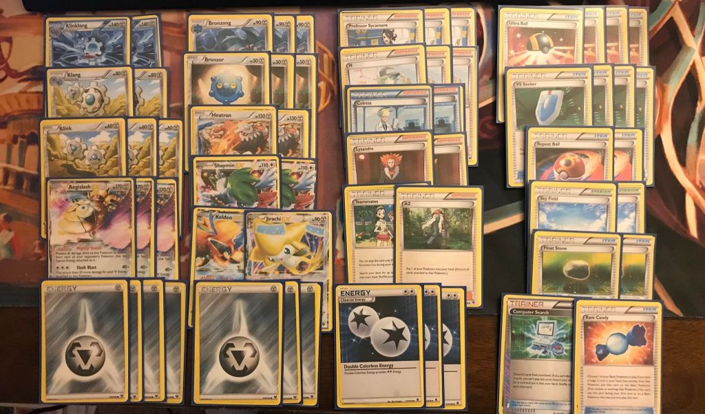 | 2 Klinklang 2 Klang 3 Klink 3 Aegislash EX 3 Bronzong 3 Bronzor 2 Heatran 2 Shaymin EX 1 Keldeo EX 1 Jirachi EX | 3 Professor Sycamore 3 N 2 Colress 2 Lysandre 1 Teammates 1 AZ 4 Ultra Ball 4 VS Seeker 2 Repeat Ball 2 Sky Field 2 Float Stone 1 Computer Search 1 Rare Candy | 7 Metal Energy 3 Double Colorless Energy |
