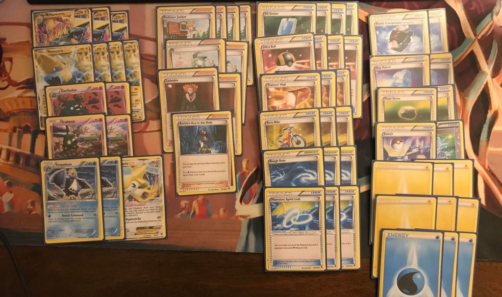 | 3 M Manectric EX 4 Manectric EX 2 Garbodor 2 Trubbish 2 Empoleon 1 Jirachi EX | 4 Professor Juniper 2 N 2 Lysandre 1 Archie’s Ace in the Hole 4 VS Seeker 4 Ultra Ball 3 Trainers’ Mail 3 Acro Bike 3 Rough Seas 3 Manectric Spirit Link 2 Battle Compressor 2 Max Potion 2 Float Stone 1 Switch 1 Computer Search | 6 Lightning Energy 3 Water Energy |