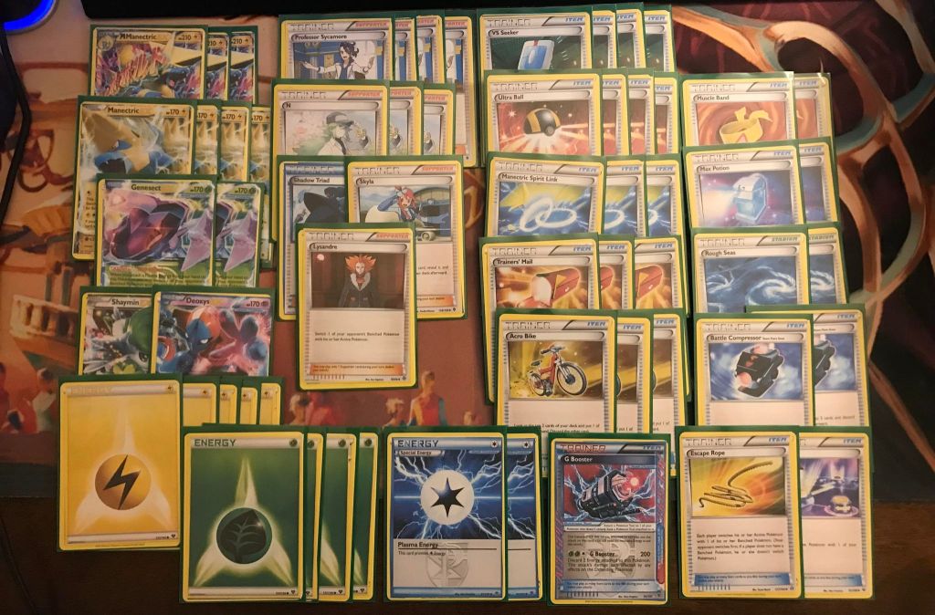| 3 M Manectric EX 4 Manectric EX 2 Genesect EX 1 Shaymin EX 1 Deoxys EX | 4 Professor Sycamore 3 N 1 Shadow Triad 1 Skyla 1 Lysandre 4 VS Seeker 4 Ultra Ball 3 Manectric Spirit Link 3 Trainers’ Mail 3 Acro Bike 2 Muscle Band 2 Max Potion 2 Rough Seas 2 Battle Compressor 1 Escape Rope 1 Switch 1 G Booster | 5 Lightning Energy 4 Grass Energy 2 Plasma Energy |