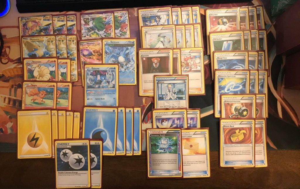 | 3 M Manectric EX 3 Manectric EX 2 Ninetales 2 Vulpix 2 Shaymin EX 1 Mewtwo EX 1 Articuno (Delta Plus) 1 Suicune | 4 Professor Sycamore 4 N 2 Lysandre 1 Pokemon Center Lady 1 Colress 4 Ultra Ball 4 VS Seeker 3 Rough Seas 3 Manectric Spirit Link 2 Enhanced Hammer 2 Muscle Band 2 Switch 1 Computer Search 1 Professor’s Letter | 5 Lightning Energy 4 Water Energy 2 Double Colorless Energy |