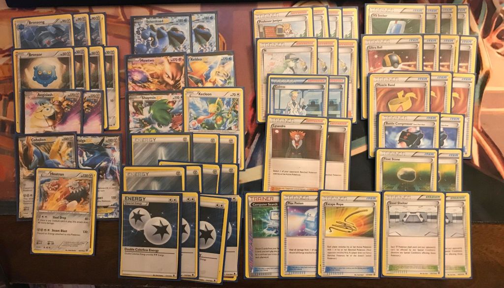 | 3 Bronzong 4 Bronzor 2 Aegislash EX 1 Cobalion EX 1 Dialga EX 1 Heatran 2 Seismitoad EX 1 Mewtwo EX 1 Keldeo EX 1 Shaymin EX 1 Kecleon | 4 Professor Juniper 3 N 2 Colress 2 Lysandre 4 VS Seeker 4 Ultra Ball 3 Muscle Band 2 Battle Compressor 2 Float Stone 2 Steel Shelter 1 Escape Rope 1 Max Potion 1 Computer Search | 7 Metal Energy 4 Double Colorless Energy |