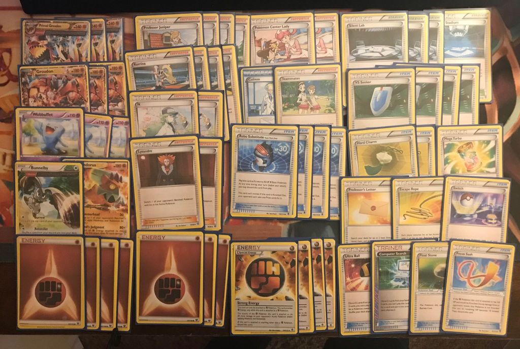 | 3 Primal Groudon EX (Omega Barrier) 3 Groudon EX 3 Wobbuffet 1 Bunnelby 1 Landorus EX | 4 Professor Juniper 4 Korrina 2 N 2 Lysandre 2 Pokemon Center Lady 1 Colress 1 Teammates 4 Robo Substitute 3 Silent Lab 1 Fighting Stadium 4 VS Seeker 2 Hard Charm 1 Mega Turbo 1 Professor’s Letter 1 Escape Rope 1 Switch 1 Ultra Ball 1 Computer Search 1 Float Stone 1 Focus Sash | 7 Fighting Energy 4 Strong Energy |