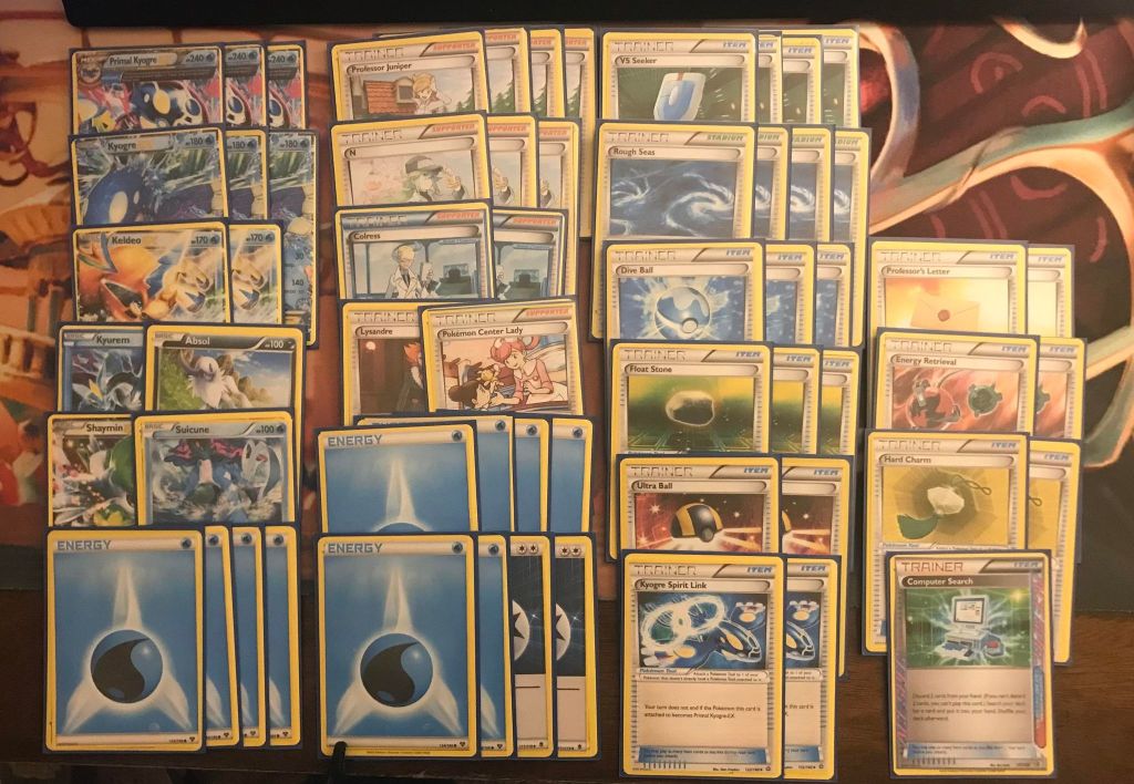 | 3 Primal Kyogre EX (Alpha Growth) 3 Kyogre EX 2 Keldeo EX 1 Kyurem 1 Absol 1 Shaymin EX 1 Suicune | 4 Professor Juniper 3 N 2 Colress 1 Lysandre 1 Pokemon Center Lady 4 VS Seeker 4 Rough Seas 3 Dive Ball 3 Float Stone 2 Ultra Ball 2 Kyogre Spirit Link 2 Professor’s Letter 2 Energy Retrieval 2 Hard Charm 1 Computer Search | 10 Water Energy 2 Double Colorless Energy |