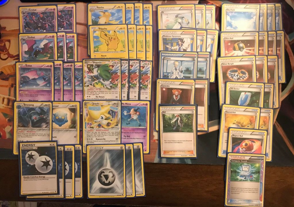 | 2 Crobat 3 Golbat 4 Zubat 4 Raichu 4 Pikachu 4 Shaymin EX 1 Bronzong 1 Bronzor 1 Jirachi EX 1 Mr. Mime | 3 N 3 Professor Sycamore 2 Colress 2 Lysandre 1 AZ 4 Sky Field 4 Ultra Ball 3 Silver Bangle 2 VS Seeker 2 Sacred Ash 1 Repeat Ball 1 Computer Search | 4 Double Colorless Energy 3 Metal Energy |
