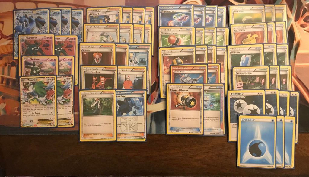 | 4 Seismitoad EX 2 Garbodor 2 Trubbish 2 Shaymin EX | 4 Professor Sycamore 4 N 2 Lysandre 1 Colress 1 Team Flare Grunt 1 Xerosic 1 AZ 1 Shadow Triad 4 HypnoToxic Laser 4 Crushing Hammer 4 Ultra Ball 2 Head Ringer 1 Enhanced Hammer 1 Computer Search 3 Float Stone 3 Muscle Band 3 VS Seeker 3 Virbank City Gym | 4 Double Colorless Energy 3 Water Energy |