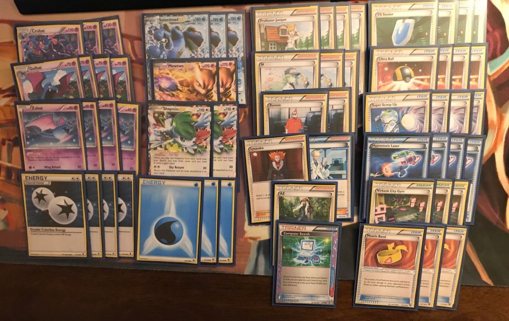 | 3 Crobat 4 Golbat 4 Zubat 3 Seismitoad EX 2 Mewtwo EX 2 Shaymin EX | 4 Professor Juniper 3 N 2 Xerosic 1 Lysandre 1 Colress 1 AZ 4 VS Seeker 4 Ultra Ball 4 Super Scoop Up 4 HypnoToxic Laser 3 Virbank City Gym 3 Muscle Band 1 Computer Search | 4 Double Colorless Energy 3 Water Energy |