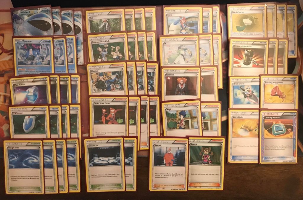 | 4 Wailord EX 3 Suicune | 4 AZ 4 Pokemon Fan Club 4 Cassius 4 Team Flare Grunt 3 Skyla 3 N 2 Lysandre 2 Hugh 1 Xerosic 1 Shauna 4 Max Potion 4 VS Seeker 4 Rough Seas 4 Hard Charm 3 Enhanced Hammer 2 Silent Lab 1 Trick Shovel 1 Startling Megaphone 1 Sacred Ash 1 Dowsing Machine | none lol |