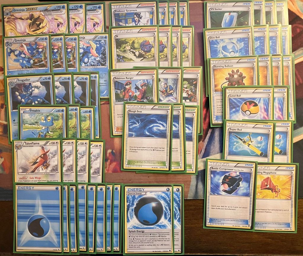 | 3 Greninja BREAK 3 Greninja (BREAKpoint) 1 Greninja (XY Base) 4 Frogadier 3 Froakie 4 Talonflame | 4 Professor Sycamore 4 N 1 Pokemon Ranger 1 Fisherman 1 Ace Trainer 3 Rough Seas 4 VS Seeker 4 Dive Ball 4 Bursting Balloon 2 Level Ball 2 Super Rod 1 Battle Compressor 1 Startling Megaphone | 8 Water Energy 2 Splash Energy |