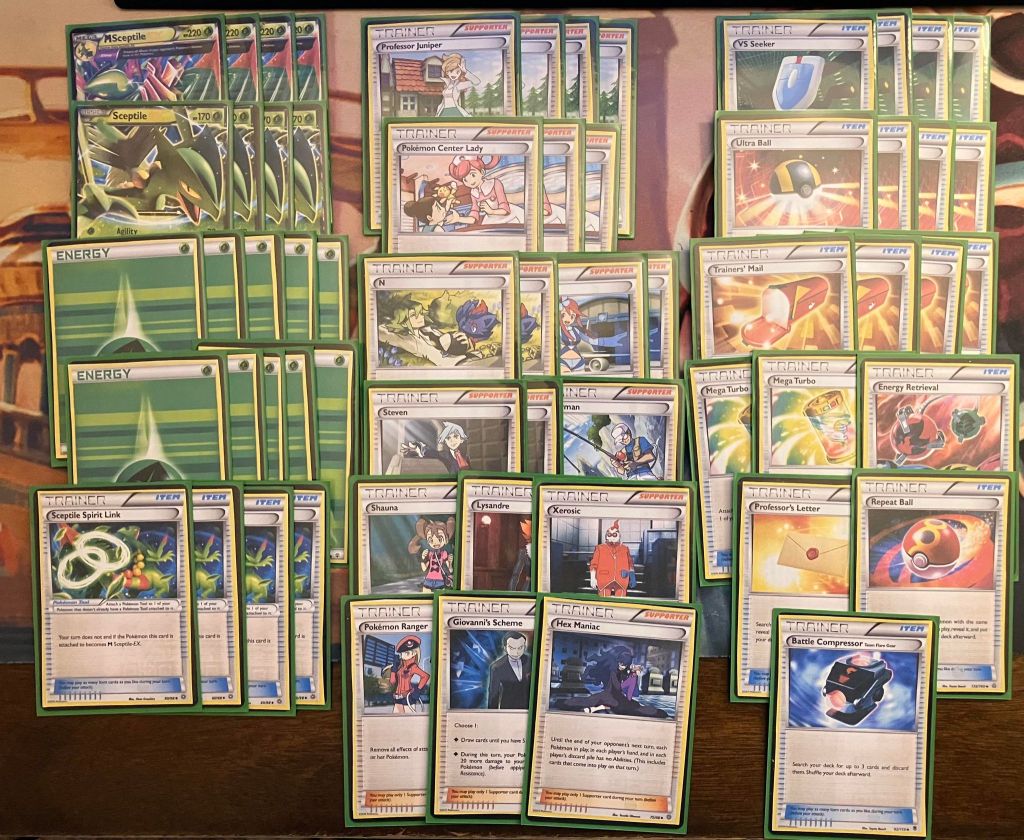 | 4 M Sceptile EX 44 Sceptile EX | 4 Professor Juniper 3 Pokemon Center Lady 2 N 2 SKyla 2 Steven 1 Fisherman 1 Shauna 1 Lysandre 1 Xerosic 1 Pokemon Ranger 1 Giovanni’s Scheme 1 Hex Maniac 4 VS Seeker 4 Ultra Ball 4 Sceptile Spirit Link 4 Trainers’ Mail 2 Mega Turbo 1 Energy Retrieval 1 Professor’s Letter 1 Repeat Ball 1 Battle Compressor | 10 Grass Energy |
