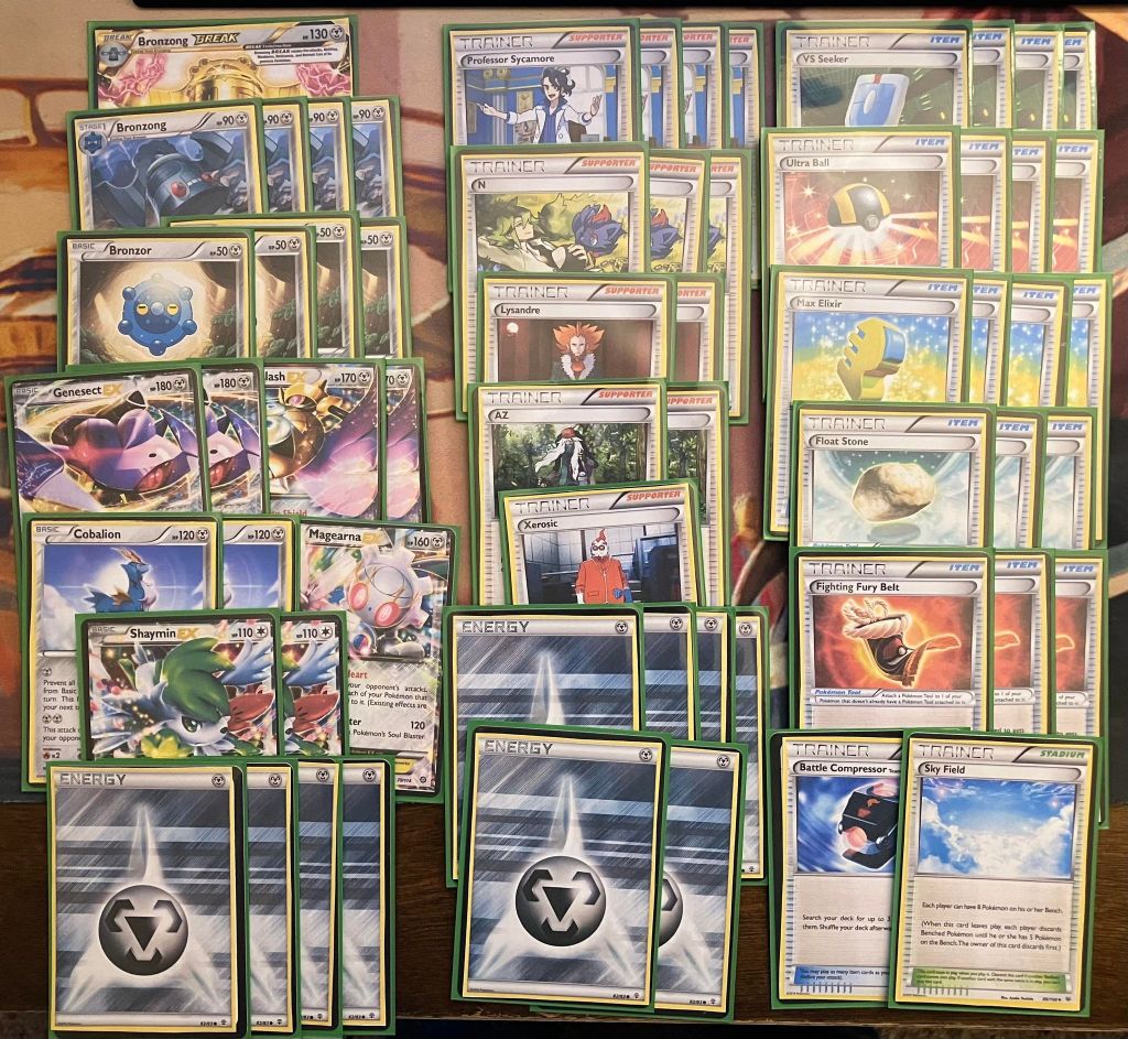 | 1 Bronzong BREAK 4 Bronzong 4 Bronzor 2 Genesect EX 2 Aegislash EX 2 Cobalion 1 Magearna EX 2 Shaymin EX | 4 Professor Sycamore 3 N 2 Lysandre 2 AZ 1 Xerosic 4 VS Seeker 4 Ultra Ball 4 Max Elixir 3 Float Stone 3 Fighting Fury Belt 1 Battle Compressor 1 Sky Field | 10 Metal Energy |