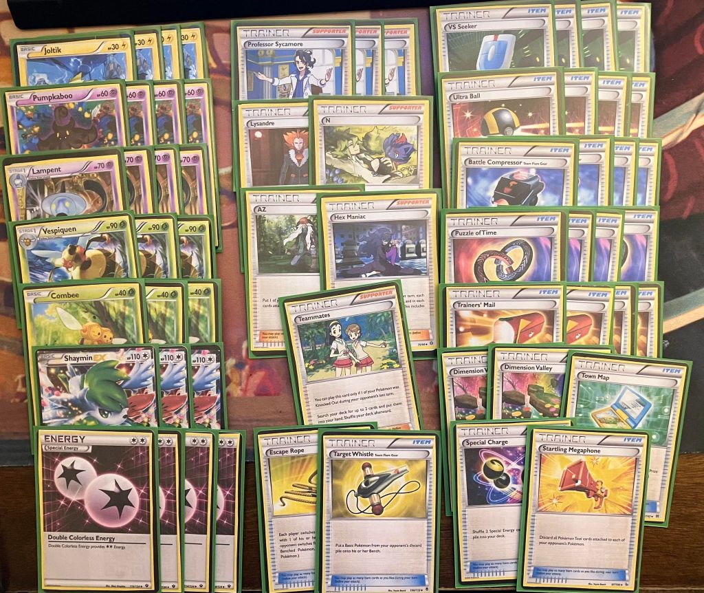 | 4 Joltik 4 Pumpkaboo 4 Lampent 3 Vespiquen 3 Combee 3 Shaymin EX | 3 Professor Sycamore 1 Lysandre 1 N 1 AZ 1 Hex Maniac 1 Teammates 4 VS Seeker 4 Ultra Ball 4 Battle Compressor 4 Puzzle of Time 4 Trainers’ Mail 2 Dimension Valley 1 Town Map 1 Escape Rope 1 Target Whistle 1 Special Charge 1 Startling Megaphone | 4 Double Colorless Energy |