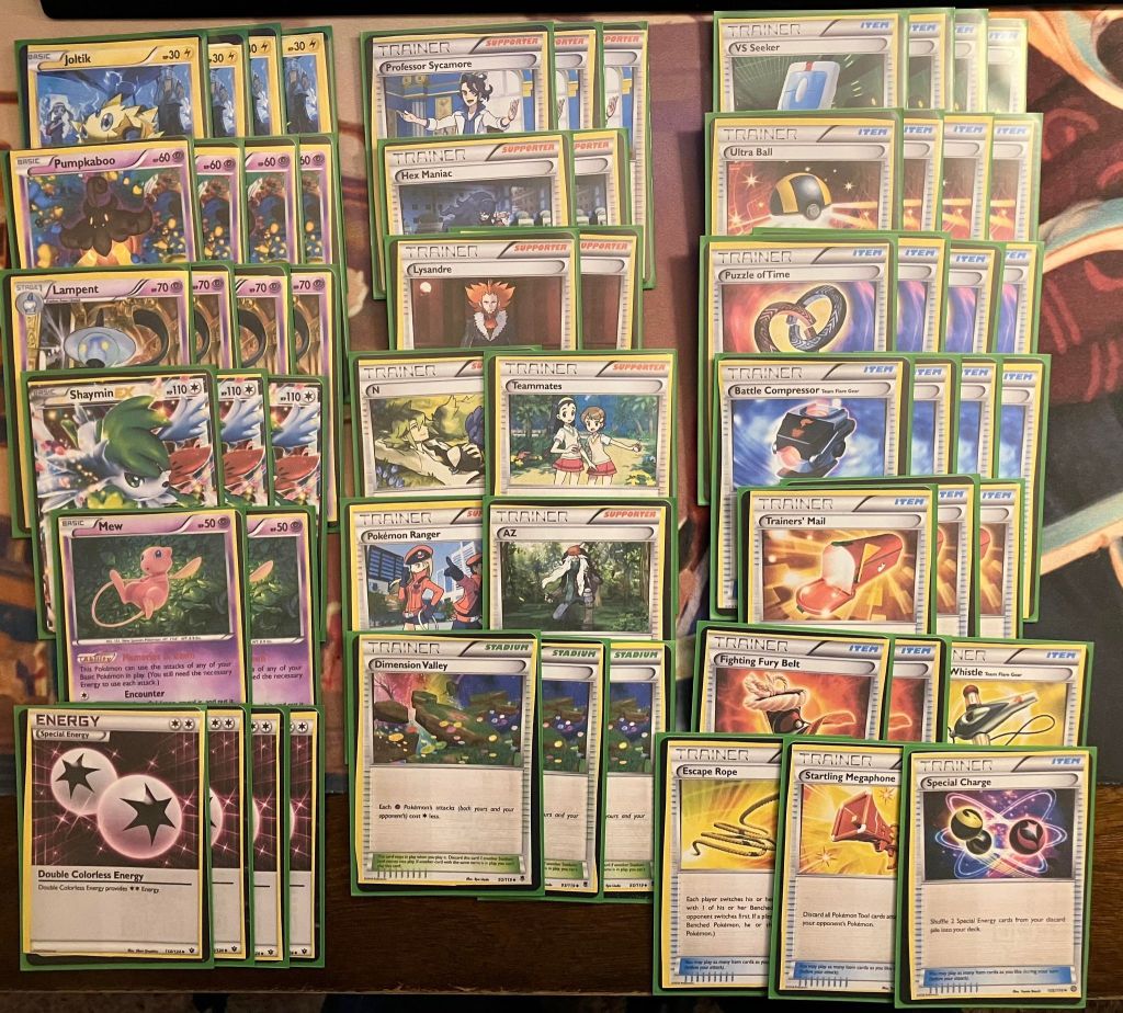 | 4 Joltik 4 Pumpkaboo 4 Lampent 3 Shaymin EX 2 Mew | 3 Professor Sycamore 2 Hex Maniac 2 Lysandre 1 N 1 Teammates 1 Pokemon Ranger 1 AZ 3 Dimension Valley 4 VS Seeker 4 Ultra Ball 4 Puzzle of Time 4 Battle Compressor 3 Trainers’ Mail 2 Fighting Fury Belt 1 Target Whistle 1 Escape Rope 1 Startling Megaphone 1 Special Charge | 4 Double Colorless Energy |