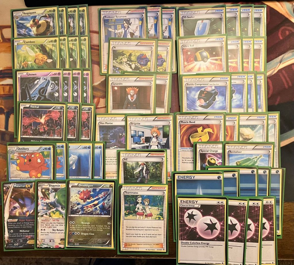 | 4 Vespiquen 4 Combee 4 U nown 3 Yveltal 2 Octillery 2 Remoraid 1 Malamar EX 1 Shaymion EX 1 Druddigon | 3 Professor Sycamore 2 N 2 Lysandre 1 Hex Maniac 1 Brigette 1 AZ 1 Teammates 4 VS Seeker 4 Ultra Ball 4 Battle Compressor 2 Muscle Band 2 Float Stone 1 Special Charge 1 Revitalizer | 5 Darkness Energy 4 Double Colorless Energy |