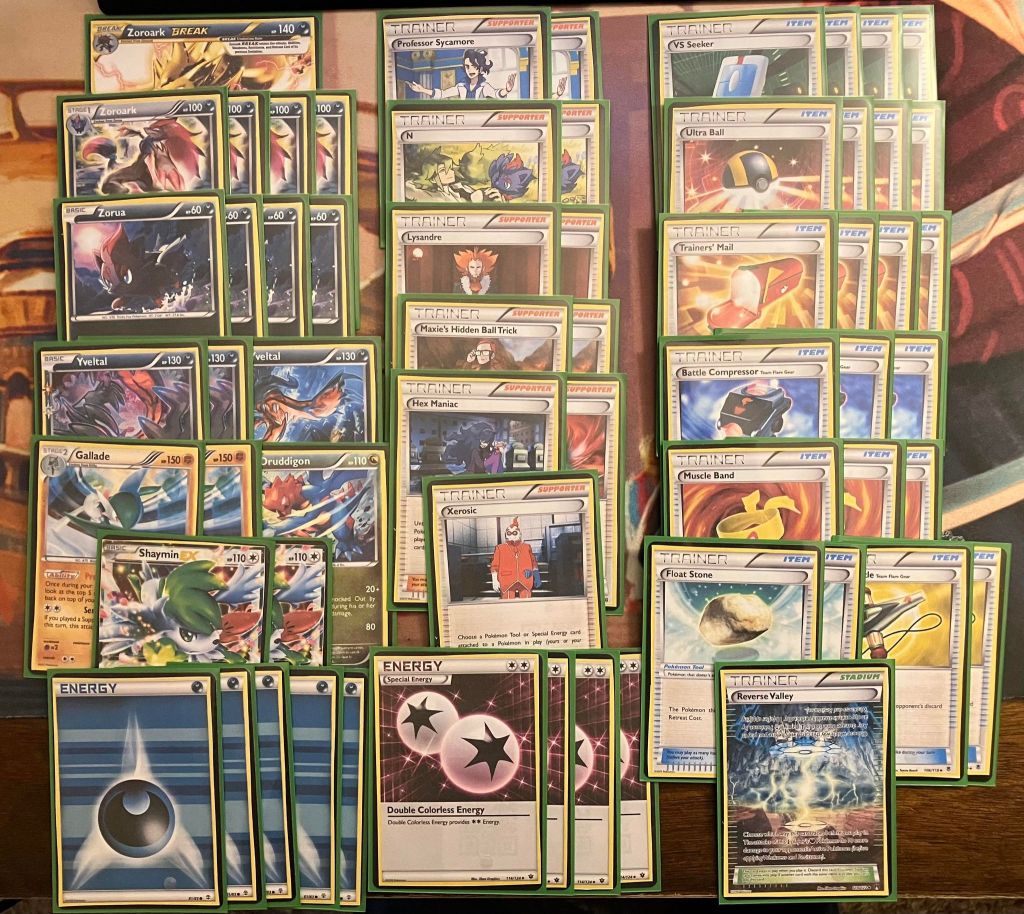 | 1 Zoroark BREAK 4 Zoroark 4 Zorua 2 Yveltal (Radiant Collection) 1 Yveltal (BREAKthrough) 2 Gallade 1 Druddigon 2 Shaymin EX | 2 Professor Sycamore 2 N 2 Lysandre 2 Maxie’s Hidden Ball Trick 1 Hex Maniac 1 Giovanni’s Scheme 1 Xerosic 4 VS Seeker 4 Ultra Ball 4 Trainers’ Mail 3 Battle Compressor 3 Muscle Band 2 Float Stone 2 Target Whistle 1 Reverse Valley | 5 Darkness Energy 4 Double Colorless Energy |