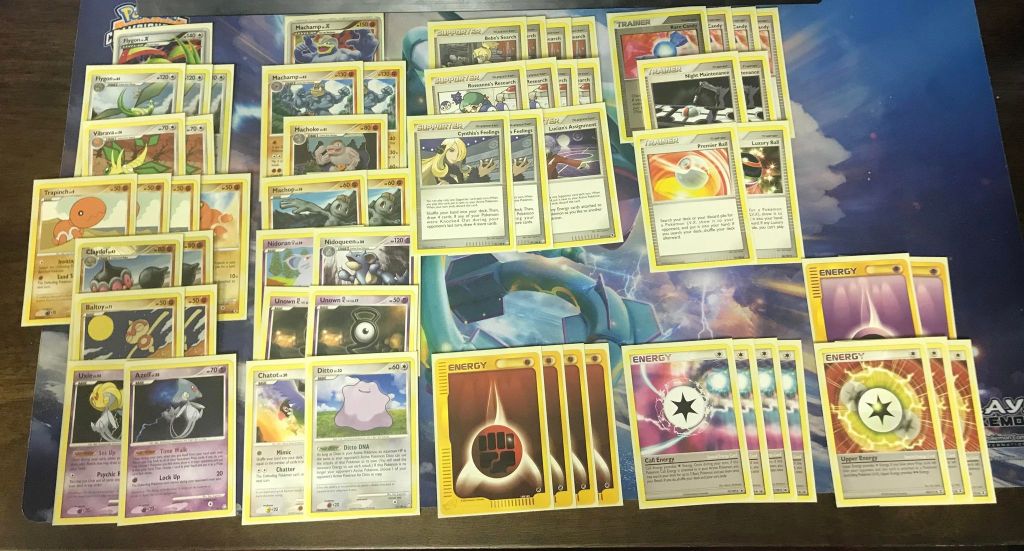 | 1 Flygon Lv. X 3 Flygon RR 2 Vibrava 4 Trapinch SW 2 Claydol 2 Baltoy 1 Machamp Lv. X 2 Machamp 1 Machoke 2 Machop 1 Nidoqueen 1 Nidoran F 1 Azelf 1 Uxie 2 Unown G 1 Ditto 1 Chatot | 4 Bebe’s Search 4 Roseanne’s Research 2 Cynthia’s Feelings 1 Lucian’s Assignment 4 Rare Candy 2 Night Maintenance 1 Luxury Ball 1 Premier Ball | 4 Call Energy 4 Fighting Energy 3 Upper Energy 2 Psychic Energy |