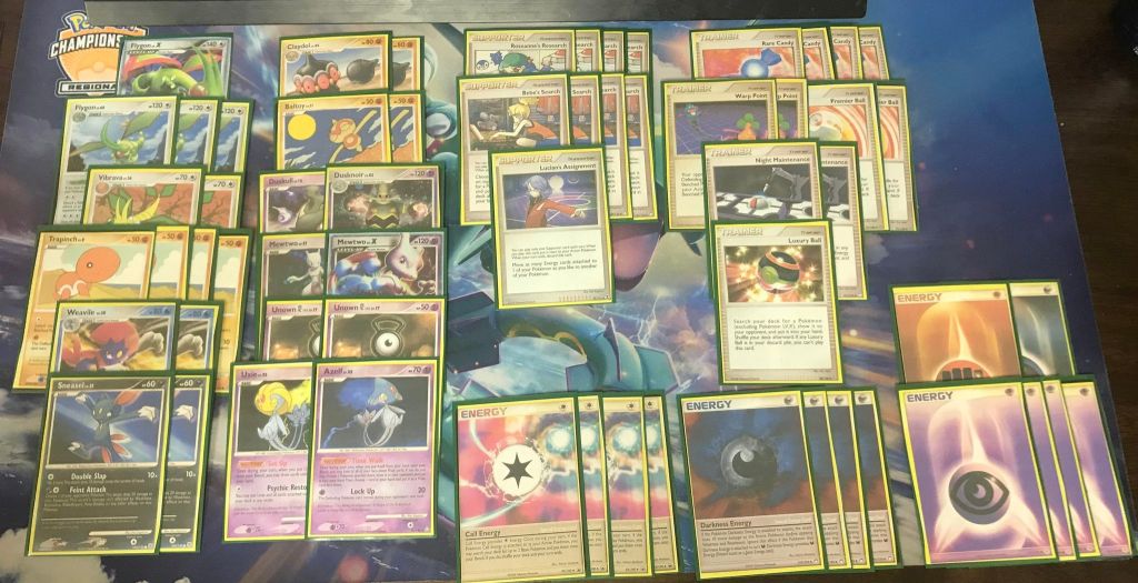 | 1 Flygon Lv. X 3 Flygon 2 Vibrava 3 Trapinch 2 Claydol 2 Baltoy 2 Weavile 2 Sneasel 1 Mewtwo Lv. X 1 Mewtwo 1 Dusknoir 1 Duskull 1 Azelf 1 Uxie 2 Unown G | 4 Bebe’s Search 4 Roseanne’s Research 2 Cynthia’s Feelings 1 Lucian’s Assignment 4 Rare Candy 2 Premier Ball 1 Luxury Ball 2 Warp Point 2 Night Maintenance | 4 Call Energy 4 Darkness Energy (Special) 4 Psychic Energy 1 Darkness Energy (Basic) 1 Fighting Energy |