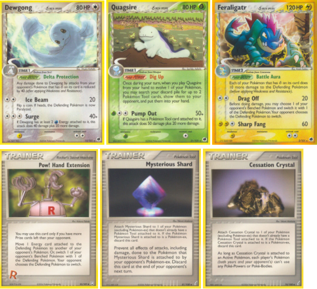The cards above are incredibly useful tech cards that will slot into almost any deck. Absol ex is a fantastic damage modifier that can turn attacks that are slightly short into easy KOs. Absol functions especially nice in spread decks, that will always have excess damage around the opponent’s board, but it does fit into just about anything. Mewtwo DS allows you to move basic energy around your side of the field. This can be really nice in conjunction with Mr. Briney’s Compassion, but it can also be used to simply conserve energy, or even to power up a pokemon more quickly. Togetic functions as a nice counter-attacker in a cube with mostly Delta Species attackers. The colorless attack cost and free retreat mean you don’t really lose much by slotting this into your deck, and it’s a very easy way to copy high-powered stage 2 attacks without much setup. Tauros CG can function as a setup pokemon with Call for family, but the its poke-power gives you a nice way to play around obnoxious stadium cards, and unlike Windstorm, you can search it out with cards like Holon Mentor. Cloyster Df is the quintessential anti-spread pokemon. It protects your benched delta species pokemon from all attack effects, including damage. (and its attack can be useful in a pinch, especially if you’re running Boost/Scramble Energy.)