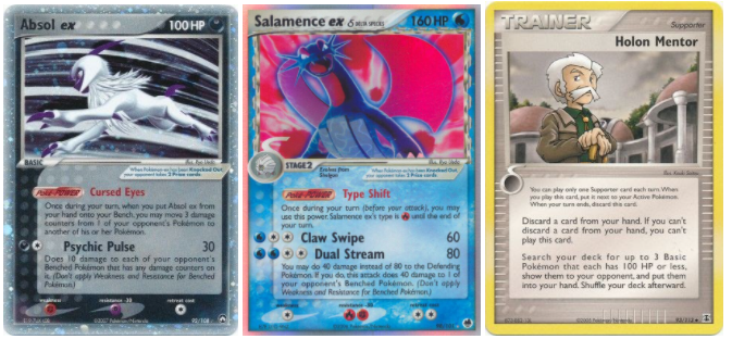 Consistency cards like Holon Mentor and Scientist fit perfectly into this category as they are a touch weaker than the prime choices (like Holon Transceiver, which can grab or re-use any Holon supporter from your deck or discard pile) but they will still slot nicely into basically any deck. There’s also a much higher amount of Mentor in this cube than there are other supporters, so you can afford to take it a little later. (Unlike Holon Transceiver, which also appears in higher quantity, most decks don’t want to run 3-4 Holon Mentor). This is also where I would slot the powerhouse pokemon that you can center your deck around – Salamence is pictured, but this is also where I’d take cards like Gardevoir, Meganium, Shiftry, etc. Strong stage 1 pokemon like Exeggutor would be good choices as well. If there’s not a premium consistency card in the pack, I think it’s perfectly fine to start thinking about who you might want to center your deck around. Absol ex is borderline 1st pickable in dedicated spread and snipe decks, but in your average deck that doesn’t focus on either trait, it’s not as necessary to value it so highly.