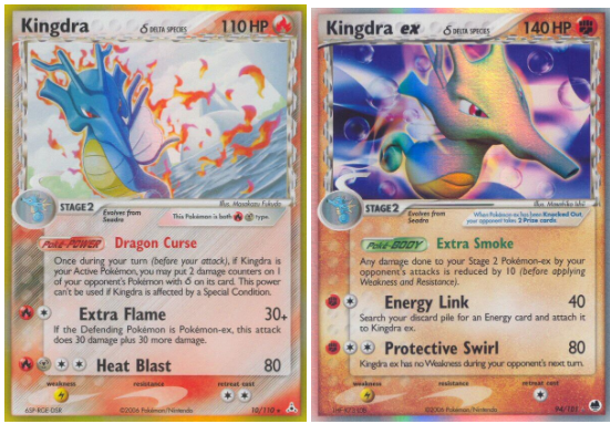 Kingdra is probably the least synergistic of the “tribal” archetypes, but it more than makes up for this in individual power. Kingdra HP can spread 20 damage around the board to any pokemon that are delta species, and its first attack punishes the opponent for running ex-heavy decks. Kingdra EX on the other hand, tanks hits really well, and also protects itself from weakness, which is very helpful against any electric decks that would otherwise run through the duo. Both of these cards can fit nicely into decks with other pokemon in the cube as well.