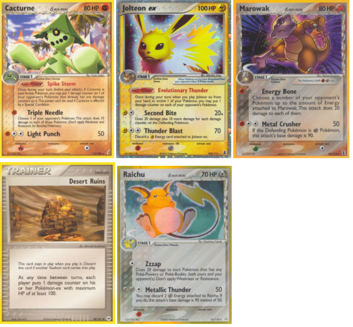 After a couple of cube test runs, we decided to add a couple of cards from outside the delta species block, since there were some effects (such as hand disruption and gust effects) that were practically non-existent in this timeframe. However we decided it would be best to keep all cards within the ex era, to avoid the power creep of Diamond/Pearl sets, which was one of our mistakes in our 1st cube.