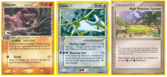 So let’s be clear – cards that are low priority are not “bad” cards. In the right deck, they can be fantastic additions. These are cards I would feel safe passing the first time I saw them in a pack, and hoping that they made their way back around the table to me. Most of the time your last picks in a pack will be pretty scripted – if a decent consistency card or a solid attacker has fallen late because nobody else is interested in the type, you can snap it up and be happy. Otherwise you just pick the card that fits best into the decks you’ve got the cards for. High Pressure and Low Pressure System are textbook examples – in a fire/water decks or grass/lightning decks, these cards can be amazing. In any other deck they’re dead cards. Thus, picking them up late is fairly easy to do, allowing your early-pick focus to be on more powerful cards, or cards that will be useful no matter what type you fall into. Latias Star was most notable for its accomplishments in LBS in 2006 – you could use Blastoise ex in combination with Holon’s Magneton to power it up in one turn. There are some similar effects in this cube (most notably Meganium ex and Metagross DX), but you can pull off some tricky shenanigans with mewtwo DS as well. Cloyster, as well as some other cards like Crystal Shard are kind of the opposite of the High/Low Pressure System conundrum – rather than being useful in ONLY one deck, they are useful AGAINST specific decks. Cloyster is a good late pickup if you want to protect yourself from snipe attacks. Crystal Shard allows you to swap your type and hit Salamence and flygon for weakness, although it’s also useful in general for fighting-types, as a lot of pokemon in this cube carry resistance to fighting.