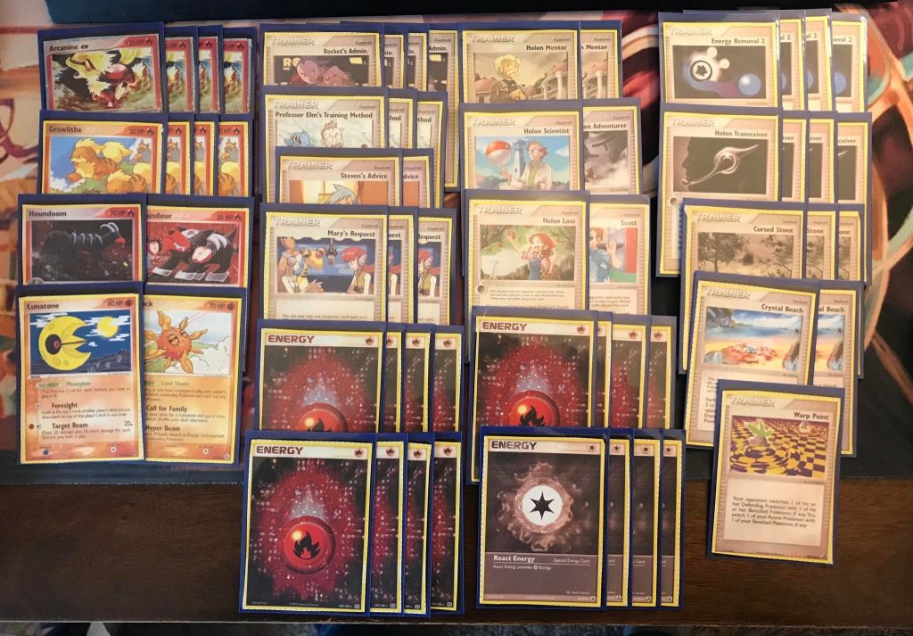 | 4 Arcanine ex 4 Growlithe 1 Houndoom 1 Houndour 1 Lunatone (ex Deoxys) 1 Solrock (ex Legend Maker) | 4 Rocket’s Admin. 3 Professor Elm’s Training Method 2 Steven’s Advice 3 Mary’s Request 2 Holon Mentor 1 Holon Scientist 1 Holon Adventurer 1 Holon Lass 1 Scott 4 Energy Removal 2 4 Holon Transceiver 3 Cursed Stone 2 Crystal Beach 1 Warp Point | 12 Fire Energy 4 React Energy |