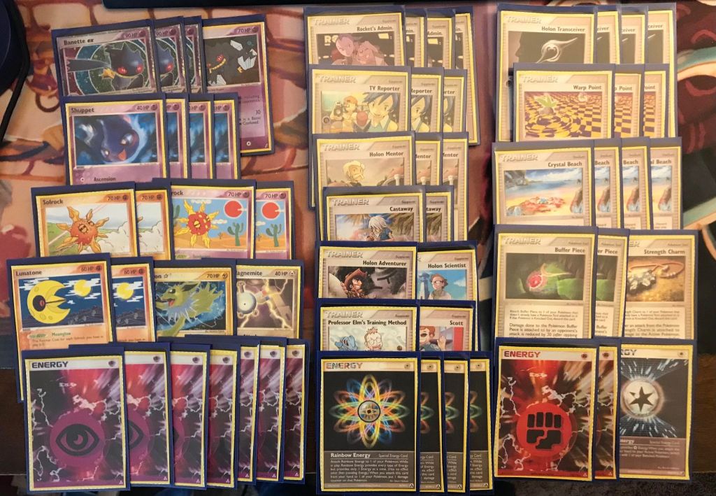 | 3 Banette ex 1 Banette (ex Crystal Guardians) 2 Solrock (ex Legend Maker) 2 Solrock (ex Deoxys) 2 Lunatone (ex Deoxys) 1 Jolteon Star 1 Holon’s Magnemite | 4 Rocket’s Admin. 3 TV Reporter 3 Holon Mentor 2 Castaway 1 Holon Adventurer 1 Holon Scientist 1 Professor Elm’s Training Method 1 Scott 4 Holon Transceiver 3 Warp Point 4 Crystal Beach 2 Buffer Piece 1 Strength Charm | 7 Psychic Energy 4 Rainbow Energy 2 Fighting Energy 1 Warp Energy |