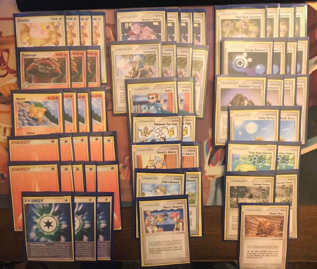 | 4 Stantler 3 Camerupt 4 Numel | 4 Rocket’s Admin. 4 Castaway 2 Scott 2 Pokemon Fan Club 2 Steven’s Advice 2 Celio’s Network 1 Mary’s Request 4 Pow! Hand Extension 4 Energy Removal 2 4 Cessation Crystal 2 Fluffy Berry 2 Team Aqua’s Hideout 2 Cursed Stone 1 Desert Ruins | 10 Fire Energy 3 Heal Energy |