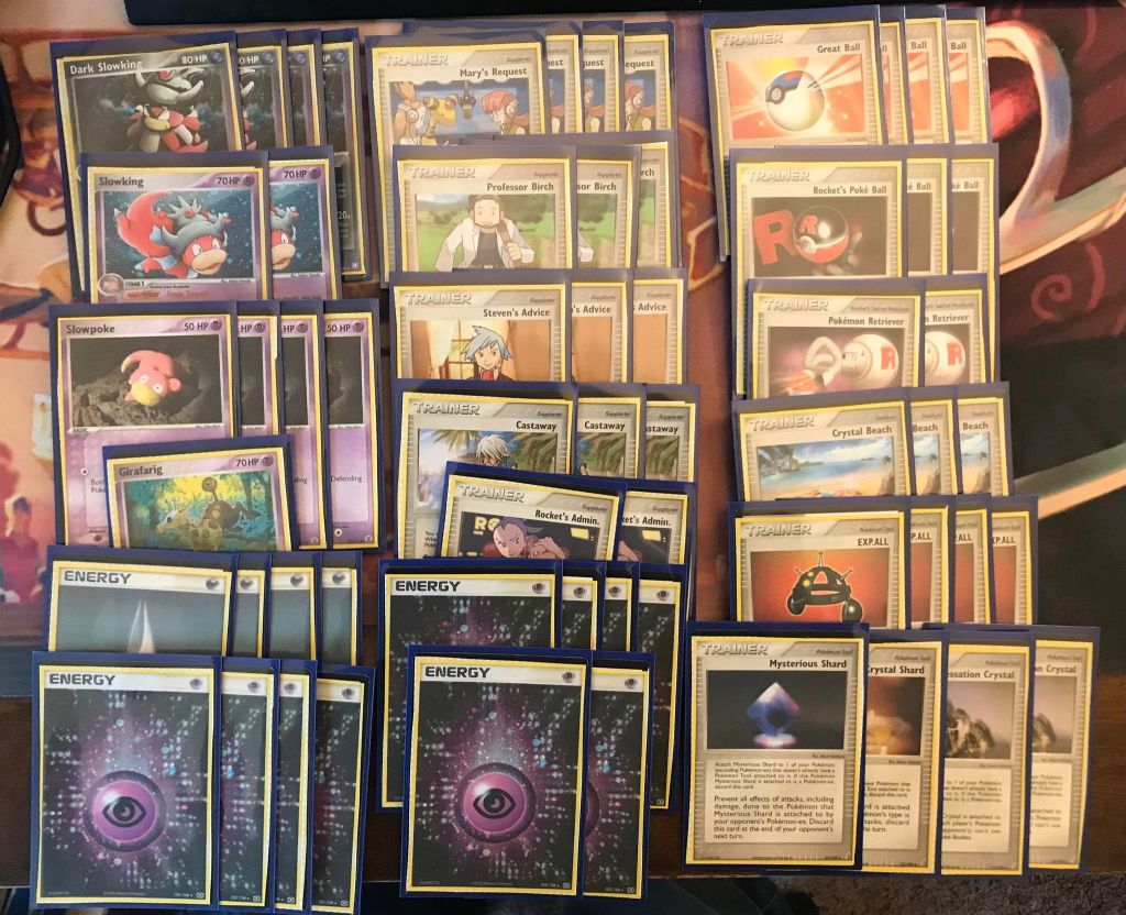 | 4 Dark Slowking 2 Slowking 4 Slowpoke 1 Girafarig | 4 Mary’s Request 3 Professor Birch 3 Steven’s Advice 3 Castaway 2 Rocket’s Admin. 4 Great Ball 3 Rocket’s Poke Ball 2 Pokemon Retriever 3 Crystal Beach 4 EXP.ALL 1 Mysterious Shard 1 Crystal Shard 2 Cessation Crystal | 4 Darkness Energy 10 Psychic Energy |