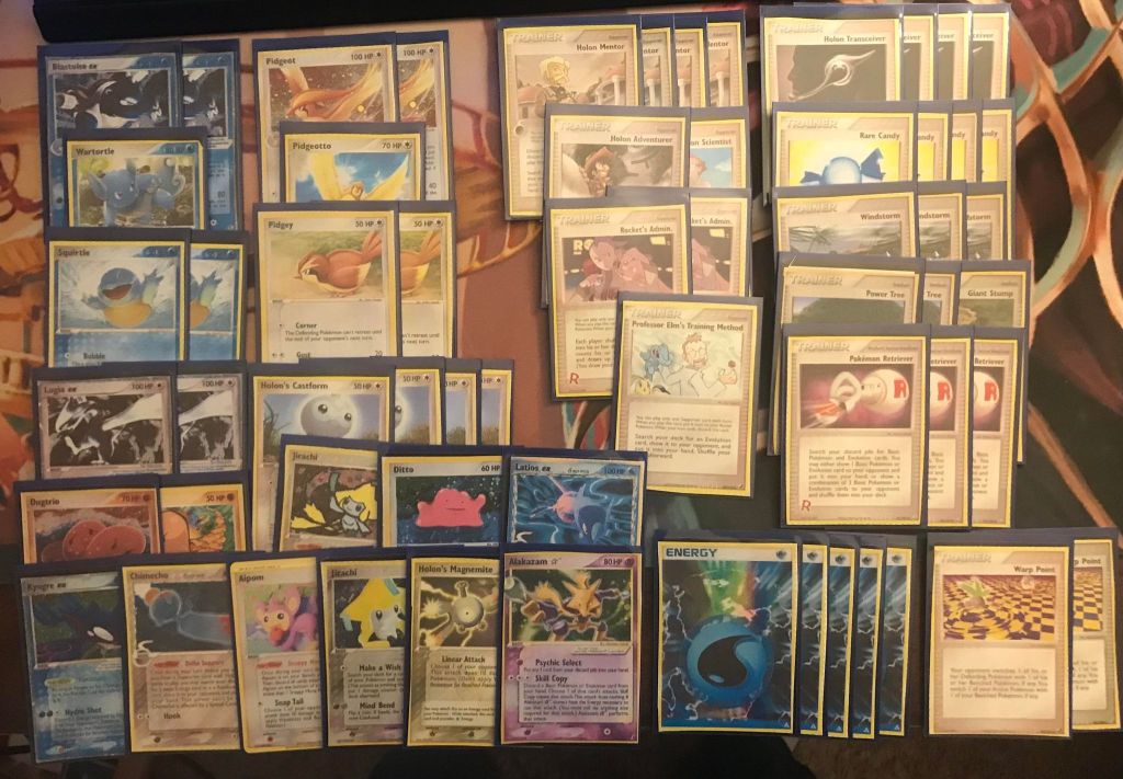 | 2 Blastoise ex 1 Wartortle 2 Squirtle 2 Pidgeot 1 Pidgeotto 2 Pidgey 2 Lugia ex 1 Dugtrio 1 Diglett 1 Jirachi 1 Ditto 1 Latios ex 1 Kyogre ex 1 Chimecho 1 Aipom 1 Jirachi 1 Alakazam Star 4 Holon’s Castform 1 Holon’s Magnemite | 4 Holon Mentor 1 Holon Adventurer 1 Holon Scientist 2 Rocket’s Admin. 1 Professor Elm’s Training Method 4 Holon Transceiver 4 Rare Candy 3 Windstorm 2 Power Tree 1 Giant Stump 3 Pokemon Retriever 2 Warp Point | 5 Water Energy |