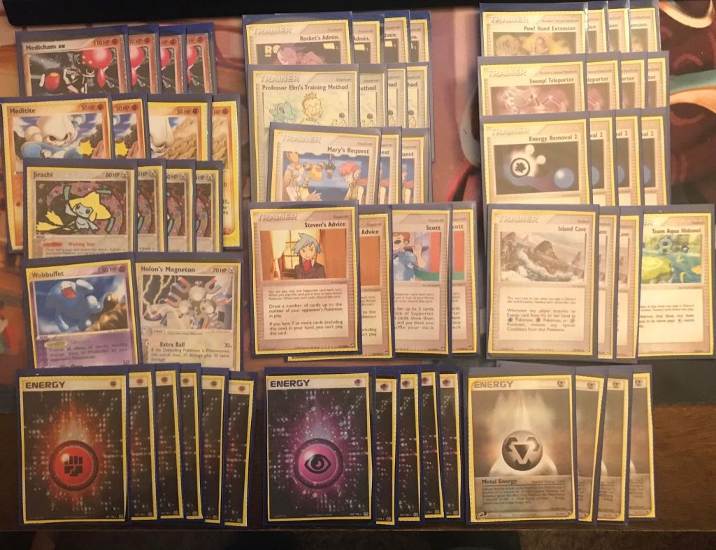 | 4 Medicham ex 2 Meditite (DR 37) 2 Meditite (DR 55) 4 Jirachi 1 Wobbuffet 1 Holon’s Magneton | 4 Rocket’s Admin. 4 Professor Elm’s Training Method 3 Mary’s Request 2 Steven’s Advice 2 Scott 4 Pow! Hand Extension 4 Swoop! Teleporter 4 Energy Removal 2 3 Island Cave 1 Team Aqua Hideout | 6 Fighting Energy 5 Psychic Energy 4 Metal Energy |
