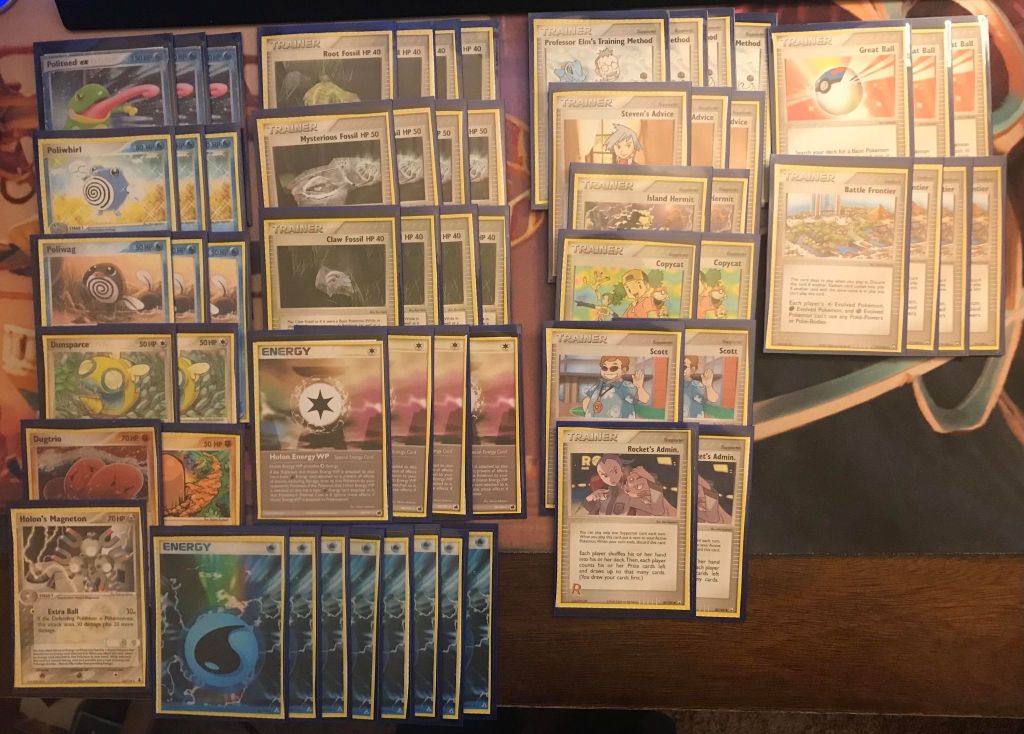 | 3 Politoed ex 3 Poliwhirl 3 Poliwag 2 Dunsparce 1 Dugtrio 1 Diglett 1 Holon’s Magneton | 4 Root Fossil 4 Mysterious Fossil 4 Claw Fossil 4 Professor Elm’s Training Method 3 Steven’s Advice 2 Island Hermit 2 Copycat 2 Scott 2 Rocket’s Admin. 3 Great Ball 4 Battle Frontier | 8 Water Energy 4 Holon Energy WP |