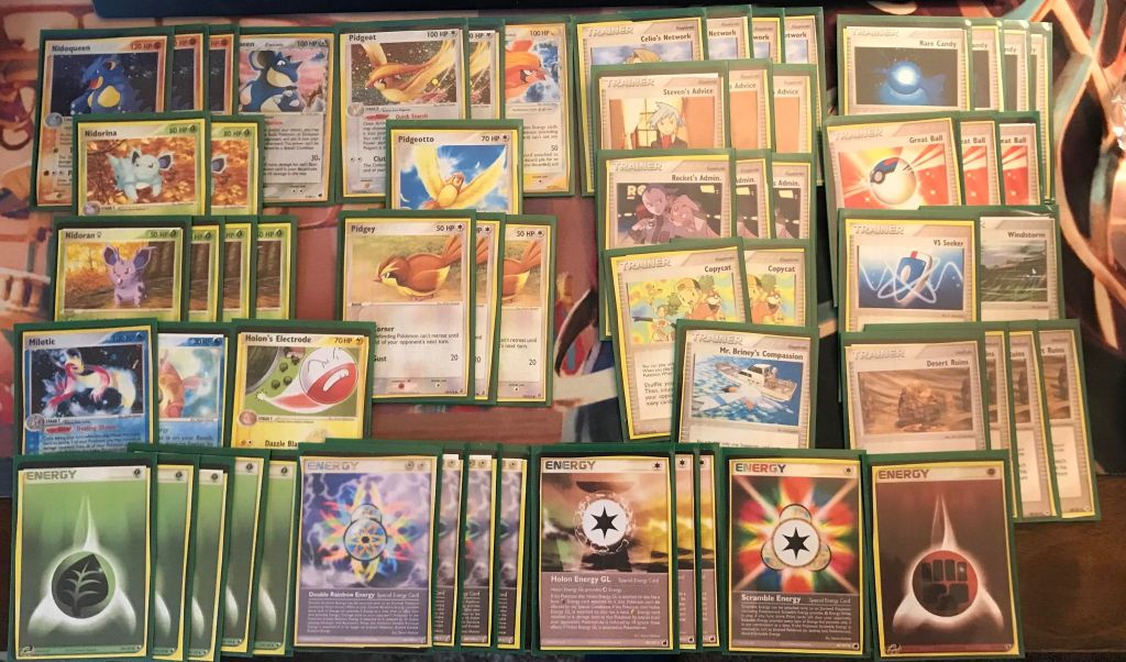 | 3 Nidoqueen (RG 9) 1 Nidoqueen (DF 7) 2 Nidorina 4 Nidoran Female 2 Pidgeot (RG 10) 1 Pidgeot (HP 14) 1 Pidgeotto 3 Pidgey 1 Milotic 1 Feebas 1 Holon’s Electrode | 4 Celio’s Network 3 Steven’s Advice 3 Rocket’s Admin. 2 Copycat 1 Mr. Briney’s Compassion 4 Rare Candy 3 Great Ball 1 VS Seeker 1 Windstorm 4 Desert Storm | 5 Grass energy 4 Double Rainbow Energy 3 Holon Energy GL 1 Scramble Energy 1 Fighting Energy |