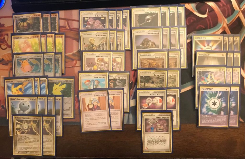 | 3 Exeggutor 4 Exeggcute 3 Raichu 3 Pikachu (HP 79) 1 Pikachu (LM 93) 4 Holon’s Castform 2 Holon’s Magnemite | 4 Rocket’s Admin. 3 Holon Mentor 2 Holon Researcher 1 Holon Scientist 1 Holon Adventurer 2 Steven’s Advice 4 Holon Transceiver 4 Cessation Crystal 2 Desert Ruins 2 Cursed Stone 2 Pokemon Retriever 1 Swoop! Teleporter | 4 Scramble Energy 3 Metal Energy 3 Double Rainbow Energy 2 Heal Energy |