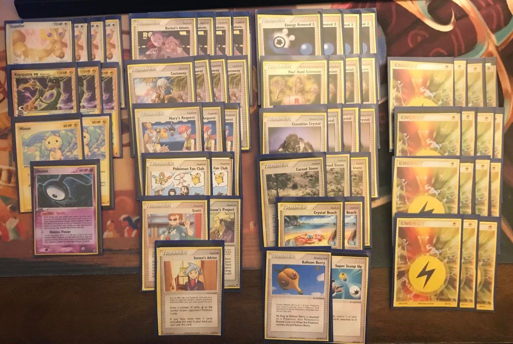 | 4 Stantler 3 Rayquaza ex 2 Minun 1 Unown (E) | 4 Rocket’s Admin. 4 Castaway 3 Mary’s Request 2 Pokemon Fan Club 1 Scott 1 Mr. Stone’s Project 1 Steven’s Advice 4 Energy Removal 2 4 Pow! Hand Extension 4 Cessation Crystal 3 Cursed Stone 2 Crystal Beach 1 Balloon Berry 1 Super Scoop Up | 15 Lightning Energy |