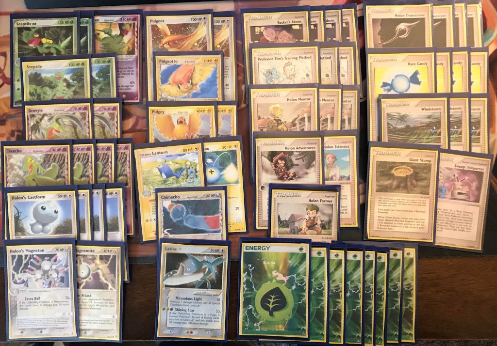 | 2 Sceptile ex (MA 93) 1 Sceptile ex (CG 96) 2 Sceptile (RS 20) 2 Grovyle 4 Treecko 2 Pidgeot 1 Pidgeotto 2 Pidgey 1 Team Aqua’s Lanturn 1 Team Aqua’s Chinchou 1 Chimecho 1 Latios Star 4 Holon’s Castform 1 Holon’s Magneton 1 Holon’s Magnemite | 4 Rocket’s Admin. 3 Professor Elm’s Training Method 3 Holon Mentor 1 Holon Adventurer 1 Holon Scientist 1 Holon Farmer 4 Holon Transceiver 4 Rare Candy 3 Windstorm 1 Giant Stump 1 Swoop! Teleporter | 8 Grass Energy |