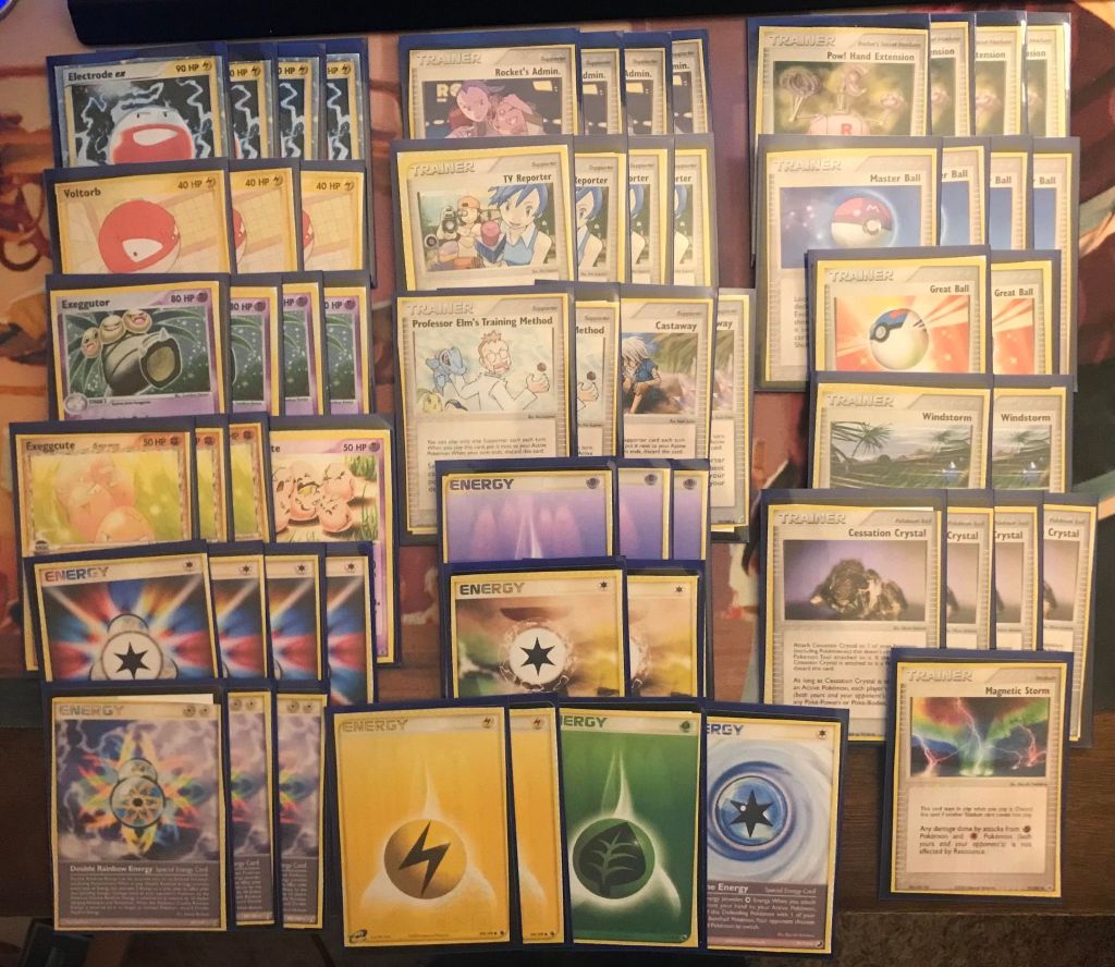 | 4 Electrode ex 3 Voltorb 4 Exeggutor 3 Exeggcute (HP 65) 1 Exeggcute (RG 33) | 4 Rocket’s Admin. 4 TV Reporter 2 Professor Elm’s Training Method 2 Castaway 4 Pow! Hand Extension 4 Master Ball 2 Great Ball 2 Windstorm 4 Cessation Crystal 1 Magnetic Storm | 4 Scramble Energy 3 Double Rainbow Energy 3 Psychic Energy 2 Holon Energy GL 2 Lightning Energy 1 Grass Energy 1 Cyclone Energy |
