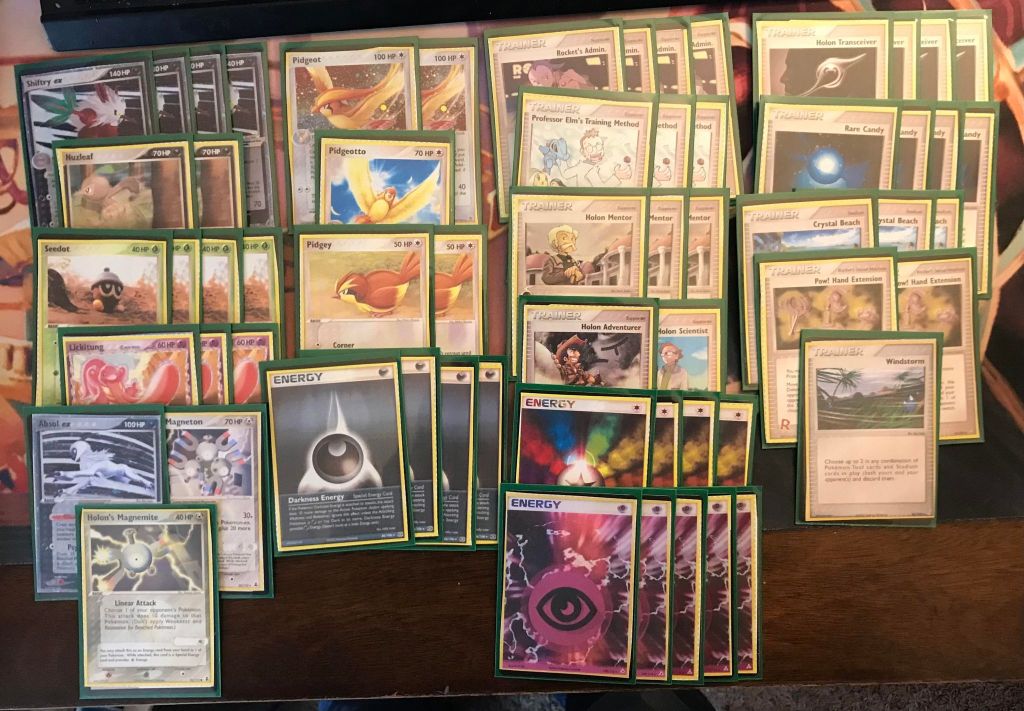 | 4 Shiftry ex (CG 97) 2 Nuzleaf 4 Seedot 3 Lickitung 2 Pidgeot 1 Pidgeotto 2 Pidgey 1 Absol ex 1 Holon’s Magneton 1 Holon’s Magnemite | 4 Rocket’s Admin. 3 Professor Elm’s Training Method 3 Holon Mentor 1 Holon Adventurer 1 Holon Scientist 4 Holon Transceiver 4 Rare Candy 3 Crystal Beach 2 Pow! Hand Extension 1 Windstorm | 4 Darkness Energy 4 Multi Energy 4 Psychic Energy |