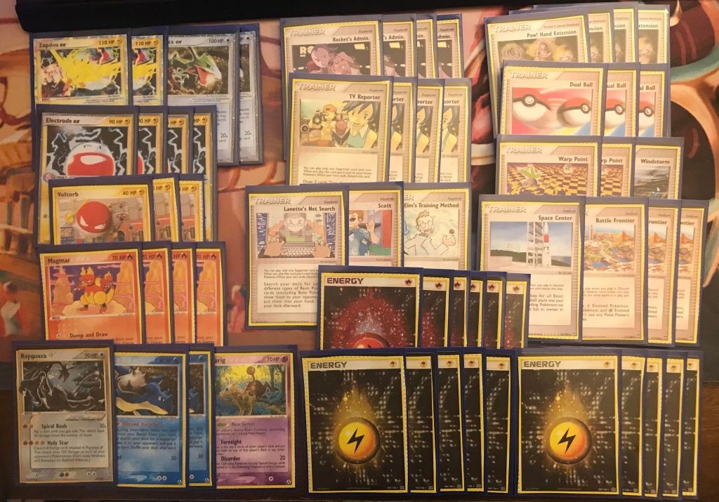 | 2 Zapdos ex 2 Rayquaza ex 4 Electrode ex 3 Voltorb 4 Magmar 2 Lapras 1 Rayquaza Star 1 Girafarig | 4 Rocket’s Admin. 4 TV Reporter 1 Lanette’s Net Search 1 Scott 1 Professor Elm’s Training Method 4 Pow! Hand Extension 3 Dual Ball 2 Warp Point 1 Windstorm 3 Battle Frontier 1 Space Center | 10 Lightning Energy 6 Fire Energy |