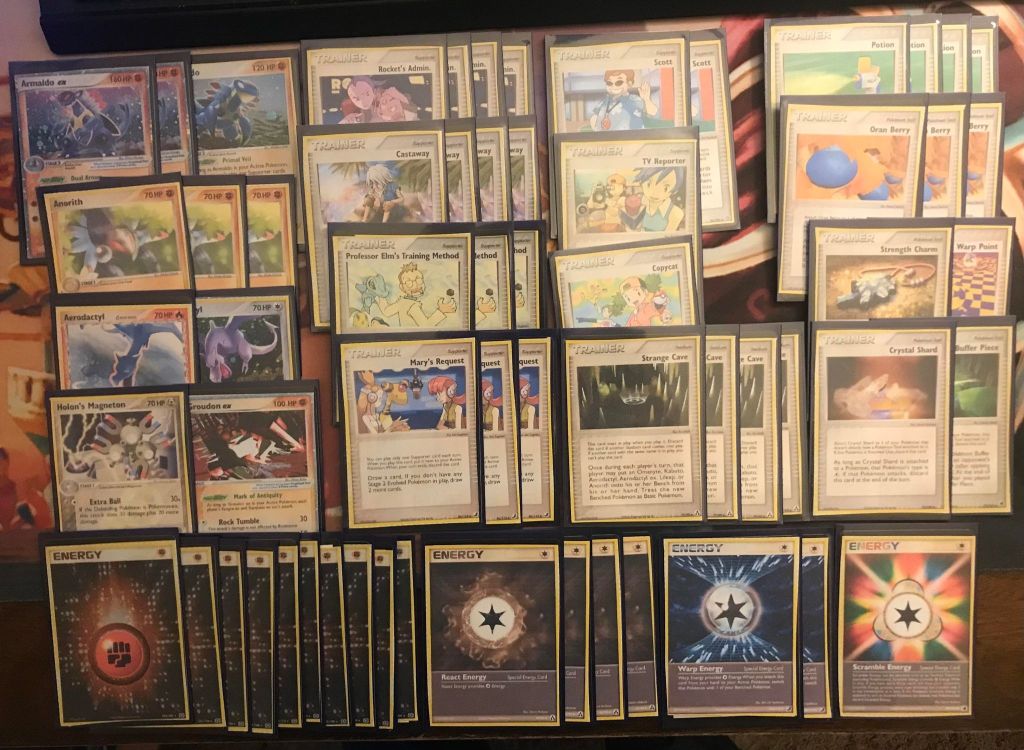 | 2 Armaldo ex 1 Armaldo 3 Anorith 1 Aerodactyl (HP 35) 1 Aerodactyl (LM 1) 1 Groudon ex 1 Holon’s Magneton | 4 Rocket’s Admin. 4 Castaway 3 Professor Elm’s Training Method 3 Mary’s Request 2 Scott 1 TV Reporter 1 Copycat 4 Strange Cave 4 Potion 3 Oran Berry 1 Strength Charm 1 Crystal Shard 1 Buffer Piece 1 Warp Point | 10 Fighting Energy 4 React Energy 2 Warp Energy 1 Scramble Energy |